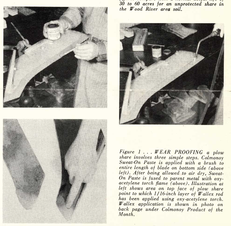 In this February 1965 Issue of Colmonoy® Alloy News, Plow share blades are hardfaced with Colmonoy® Sweat-On Paste and Wallex™ alloys.