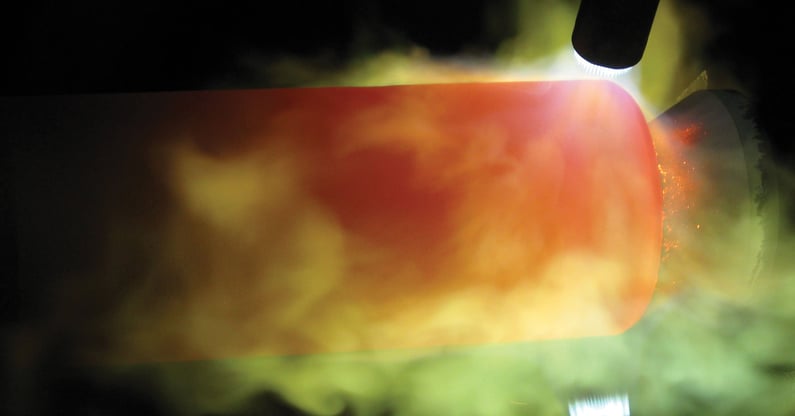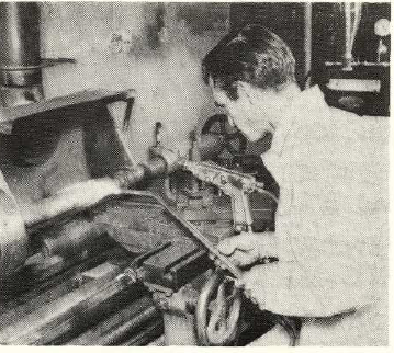 FUSING the Colmonoy alloy coating to a pump plunger. Plunger has been previously machined undersize, grit blasted and Spraywelded with 0.045 in. coat of Colmonoy alloy in powder form. The coating is fused to the base metal using an oxy-acetylene torch flame as shown. The plunger is then finish ground.